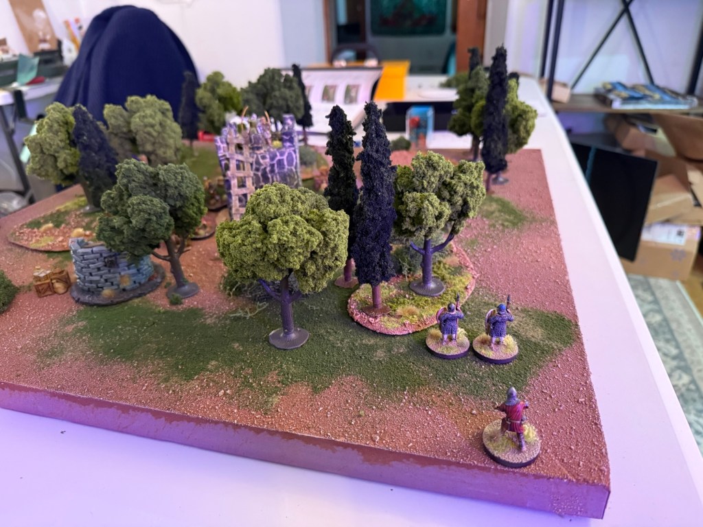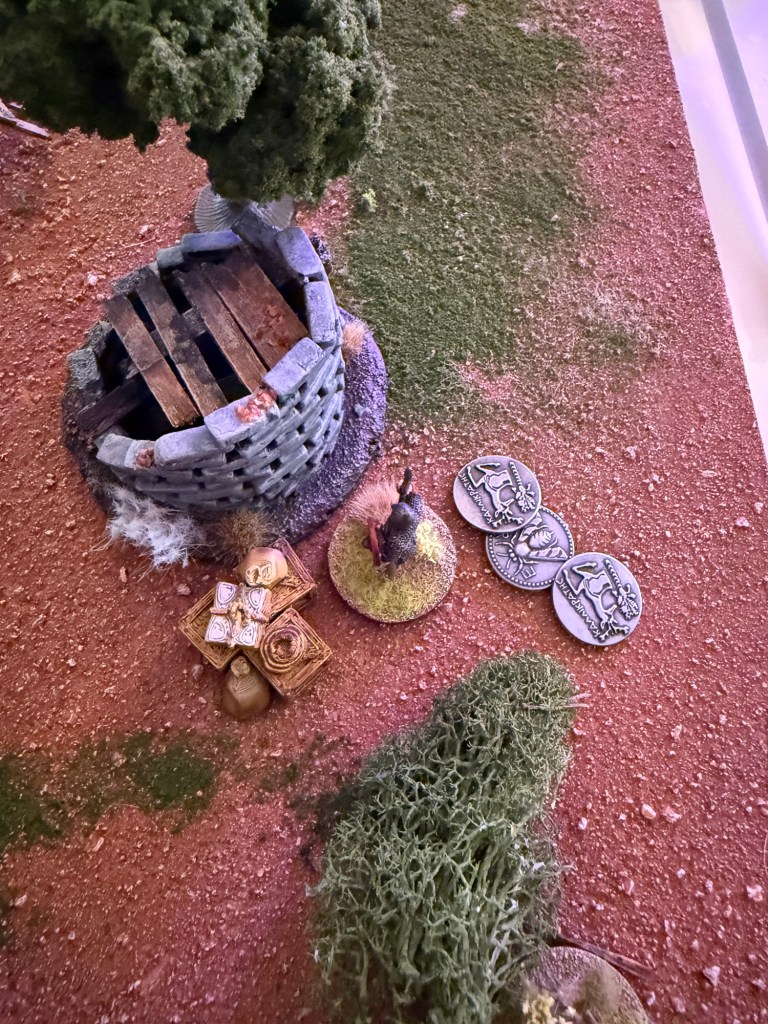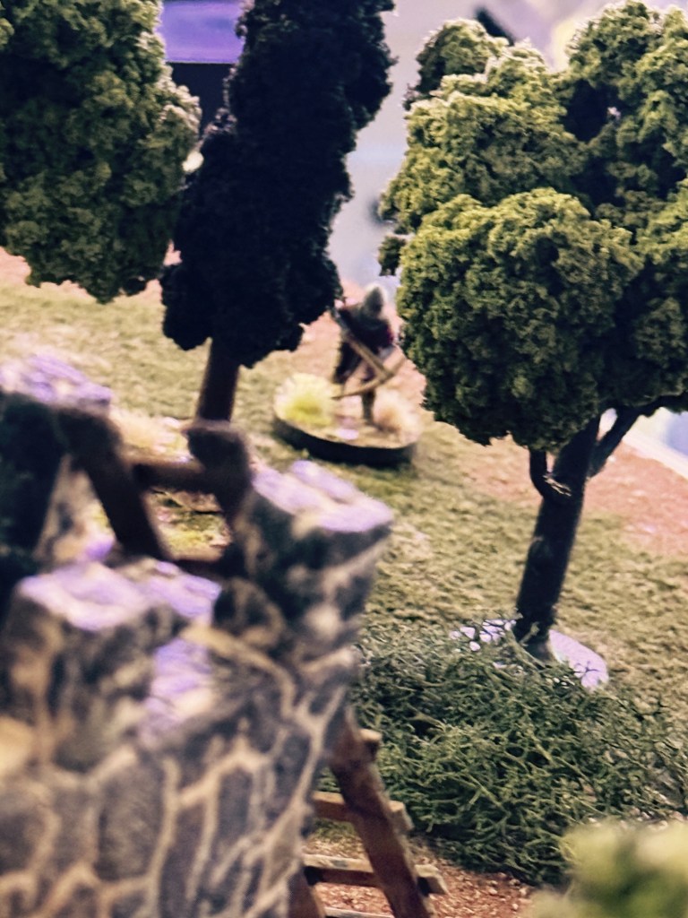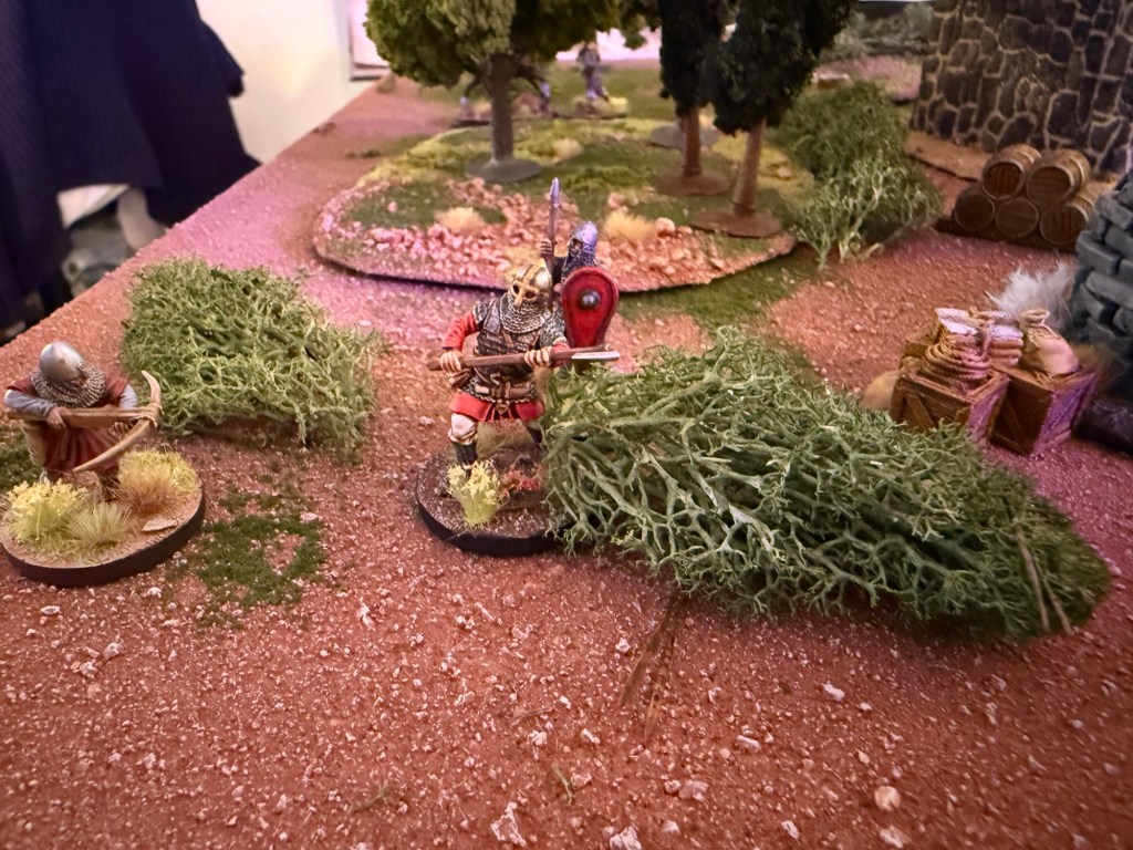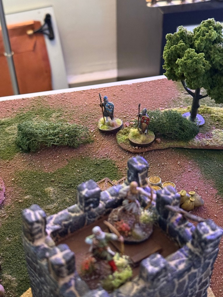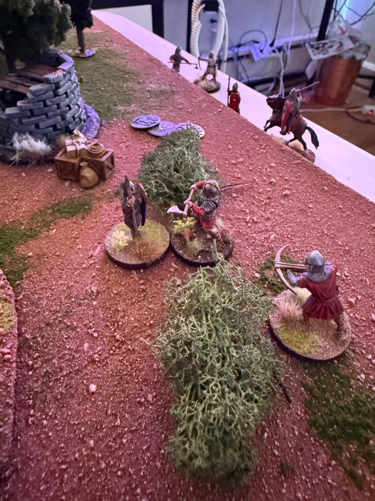 A rooftop Varangian bowman takes aim at a crossbowman. He needs a 6 due to range and misses on a result of 2. Second bowman shoots at the same target but also misses. *Missed rule: Bowmen can shoot twice if they don’t move. I remember this later in the game.