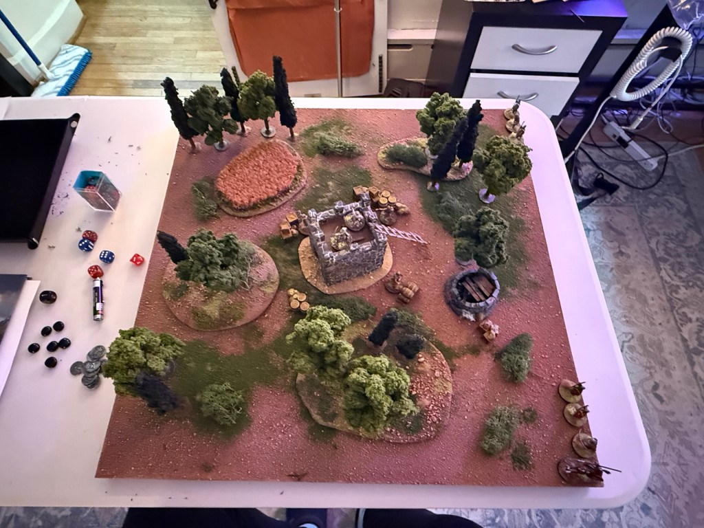 This was a first playtest of a scenario for 250pt. warbands on a 2’x2’ board. Terrain was woods, a cultivated field, a small fort, and scatter terrain that included several potential loot locations represented by barrels and crates.
