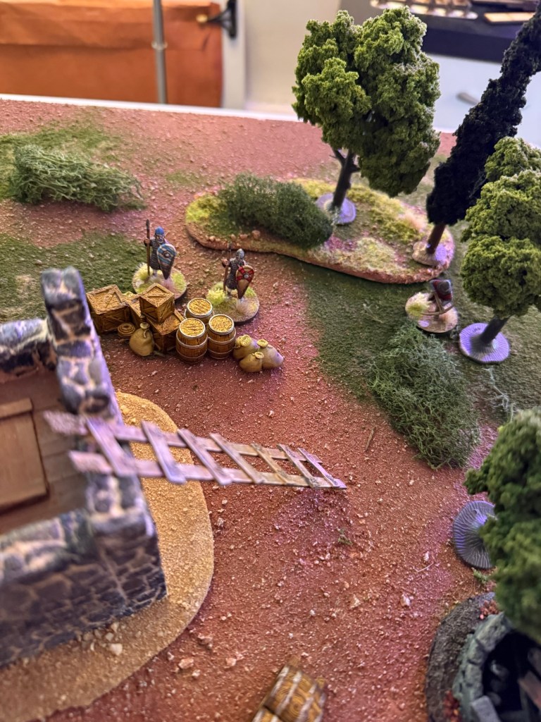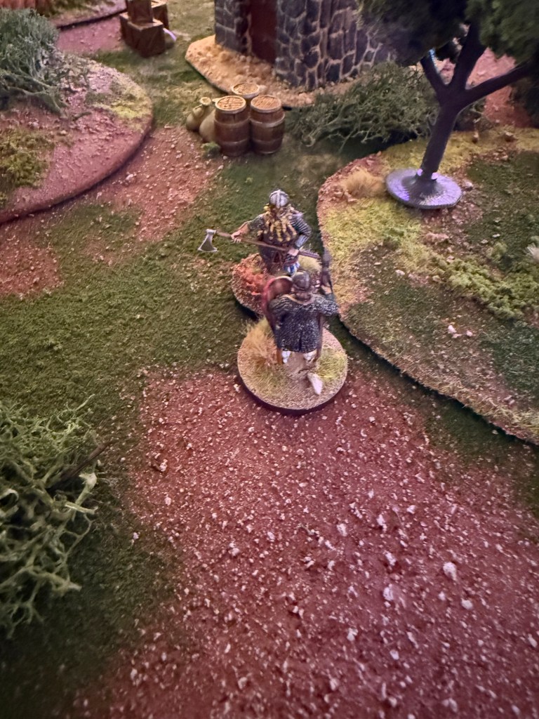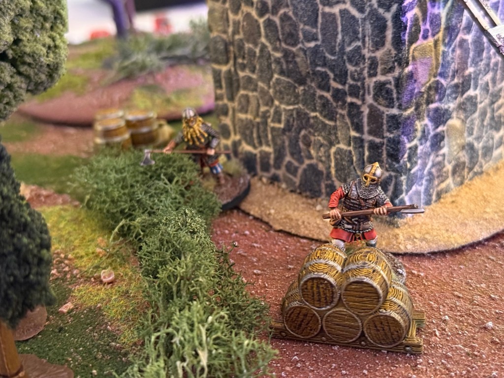 The Normans rolled as attacker and deployed on a randomized board edge. The Varangians deployed within 6” of the center of the board. The axemen took up defensive positions amidst the crates and barrels and the two bowmen deployed on the roof of the fort.