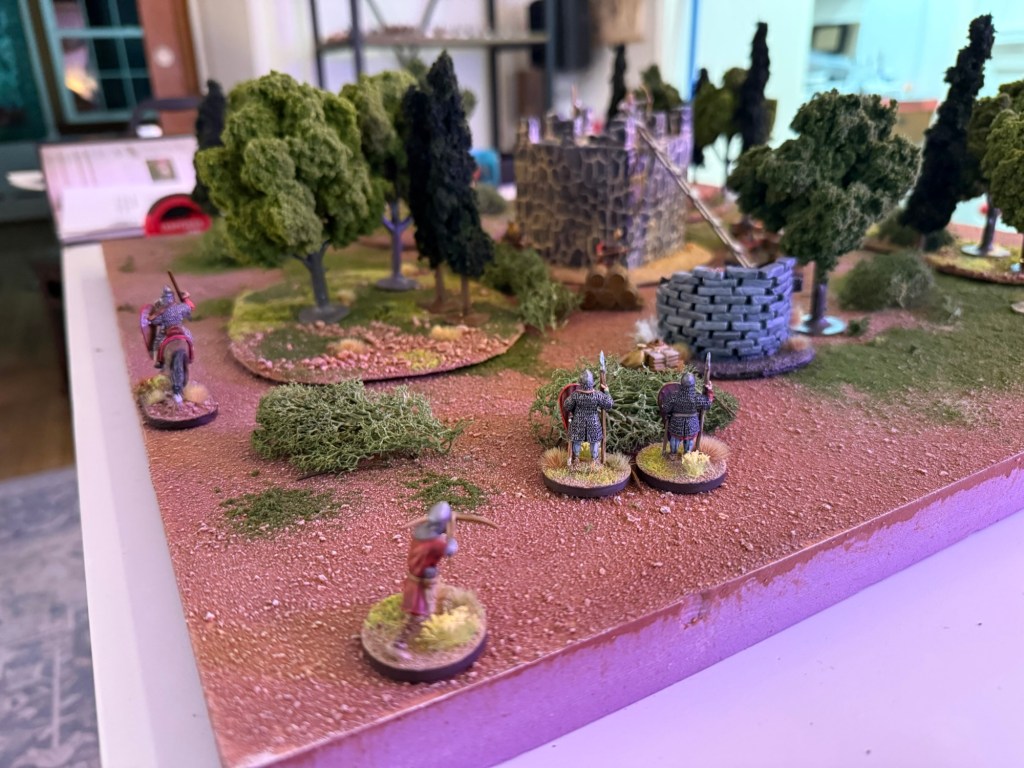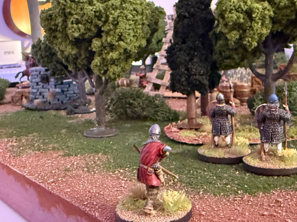 With the other crossbowman in combat, the Varangian bowmen take their shots at the unengaged crossbowman, but both miss, needing sixes to hit.