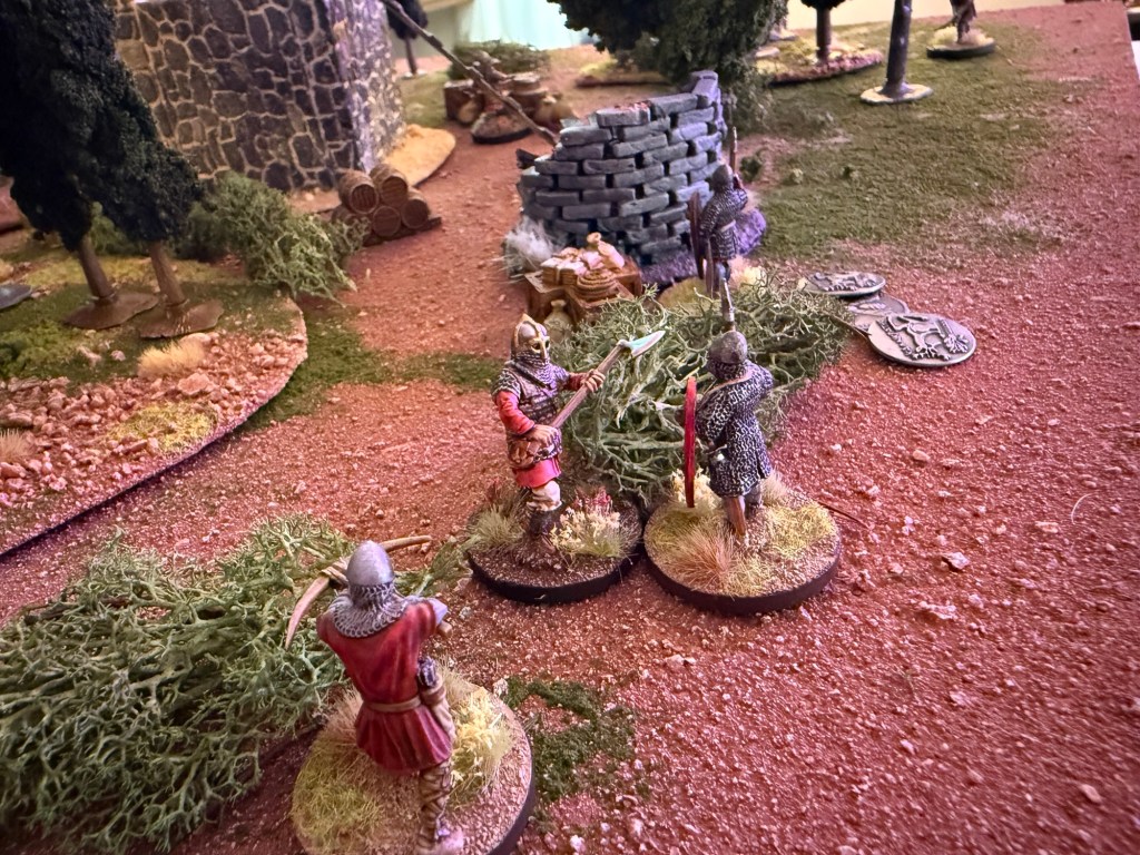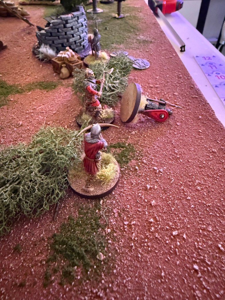 The chieftain continues to ride up the left flank. Both crossbowmen move up to get closer to targets. One Norman warrior on the right takes cover behind a bush. Another moves to explore some loot next to the collapsed granary and scores an exceptional loot result of 3!
