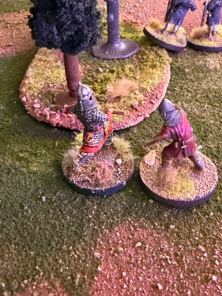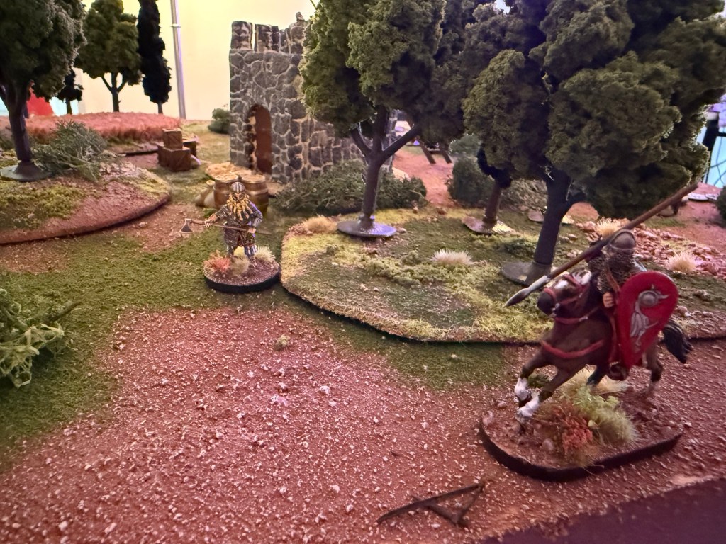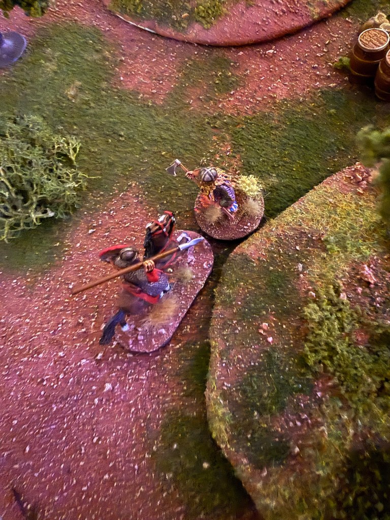 The Varangian swings with a +1 to hit and misses, rolling a natural “1”. As he dodges the strike, the Norman picks up a large rock and bashes the Varangian in the head (rolling a six), instantly killing him having failed his armor save!