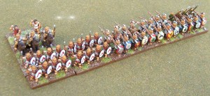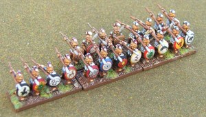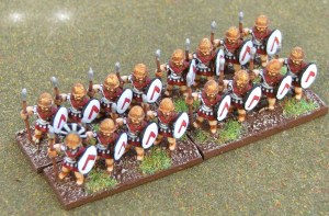 This army was built as an enemy for my Alexandrian Macedonian army, specifically to represent the army of King Agis III, who was defeated by Alexander’s regent Antipatros at Megalopolis in 331 BC. The figures are all vintage Mike’s Models. Citadel paints and LBM shield transfers were used, except on the Spartan shields, which were hand painted. Below are pictures of the pertinent elements. Psiloi, Aux, and Cav. can be seen in the Macedonian gallery.